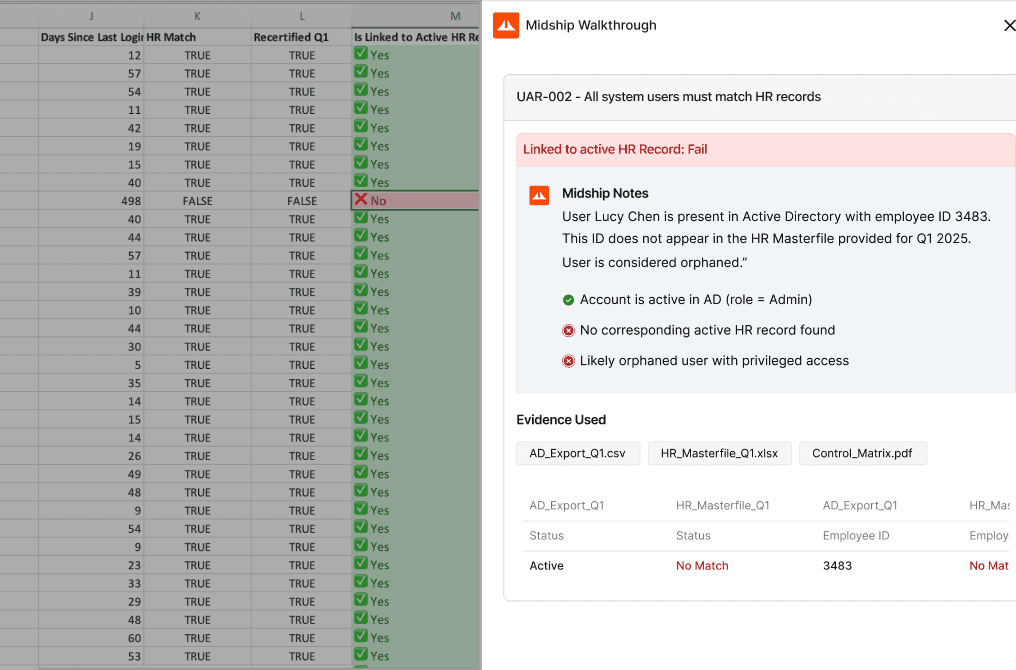 Midship’s agent runs your control test end-to-end — validating data, linking every result to its source, and explaining exactly why a sample passed or failed. You get a clear audit trail, not just output.